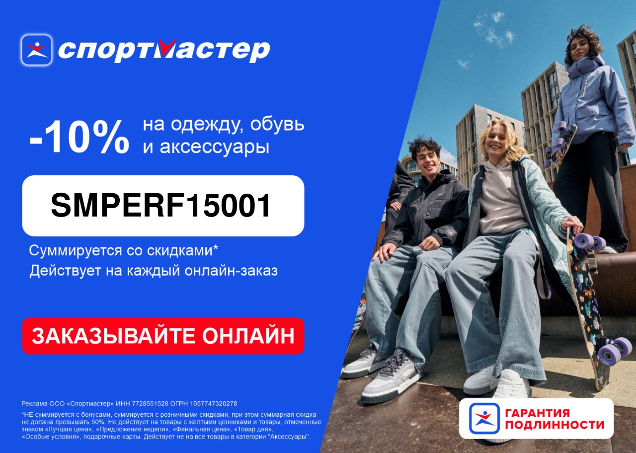 - не действует на товары c жёлтыми ценниками и товары, отмеченные знаком «Лучшая цена», «Предложение недели», «Финальная цена», «Товар дня», подарочные карты Спортмастера: