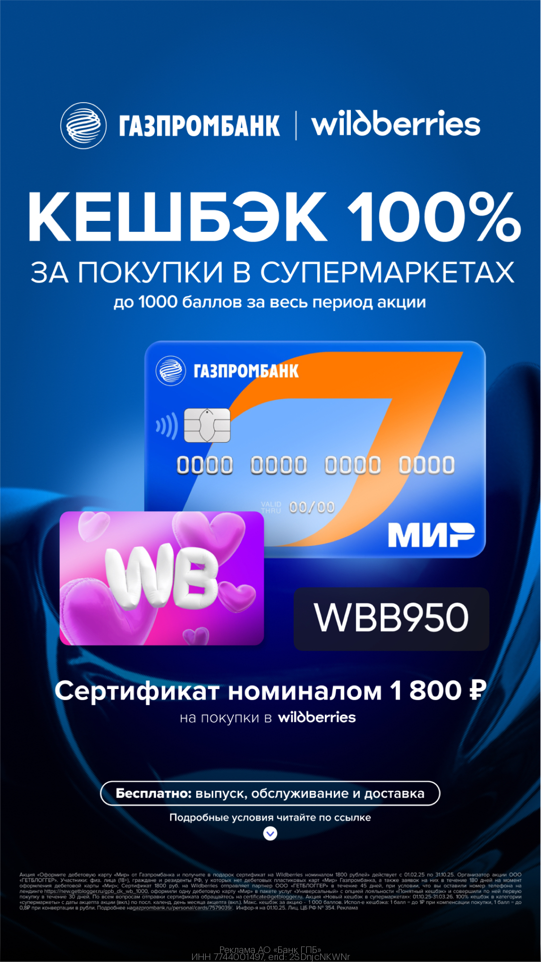 Акции доступны для дееспособных граждан РФ, достигших 18-летнего возраста, у которых нет дебетовой карты Газпромбанка и заявки на карту в течение 180 дней и более.