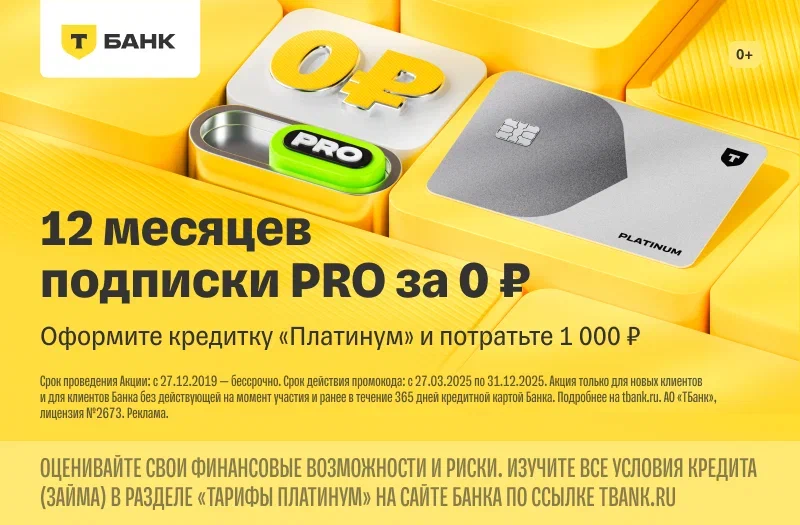 ​Кредитная карта Платинум от Т-Банка с бесплатной подпиской Pro за траты от 1000 ₽​ в течение 12 месяцев