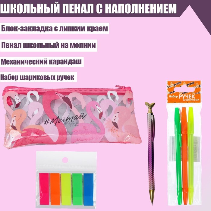 Пенал-косметичка школьный Мечтай с наполнением (набор ручек, карандаш механический, блок-закладка)