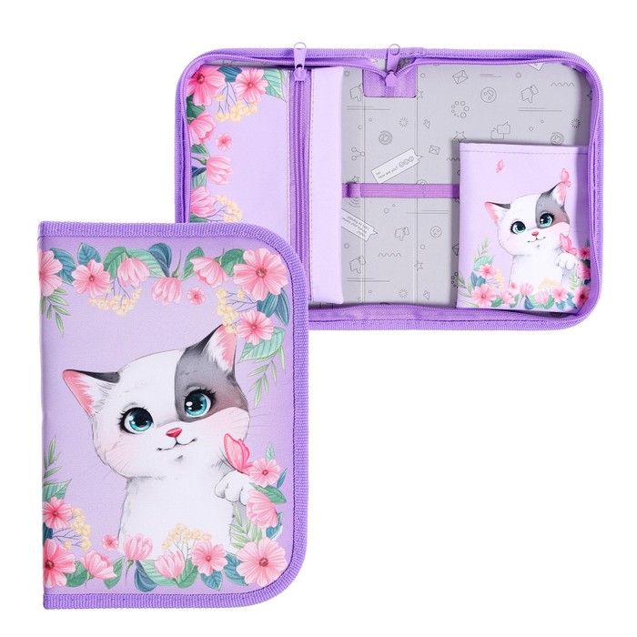 Пенал школьный твердый 140 х 210 х 40 мм, откидной карман и косметичка, тканевый, Calligrata Content «Котик в цветах»
