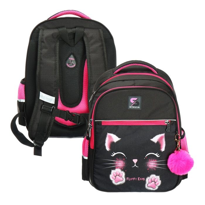 Рюкзак школьный, 40 х 33 х 19 см, эргономичная спинка, Stavia «Мордашка», чёрный/розовый