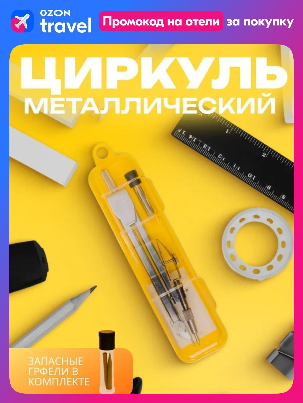 Циркуль школьный для черчения / готовальня / 110 мм с грифелями в пластиковом пенале