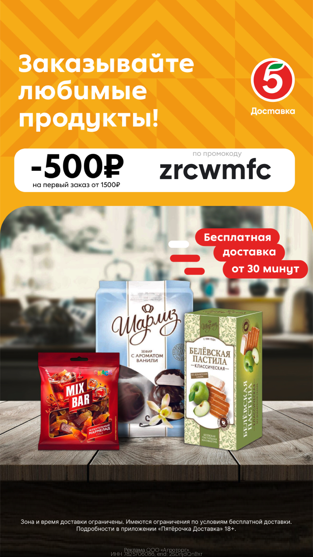 Главная страница » Скидка 500 рублей на первый заказ от 1500 рублей Скидка 500 рублей на первый заказ от 1500 рублей Admin 20.10.2025 Питание и быт химияПятерочка Доставка SaveSavedRemoved 0 Оценка+5 0 13 К скидке zrcwmfc Оценка+5 К скидке zrcwmfc Доставка осуществляется в городах присутствиях сервиса, подробная информация в приложении Пятёрочка Доставка. Стоимость доставки может измениться, актуальную информацию уточняйте в мобильном приложении.