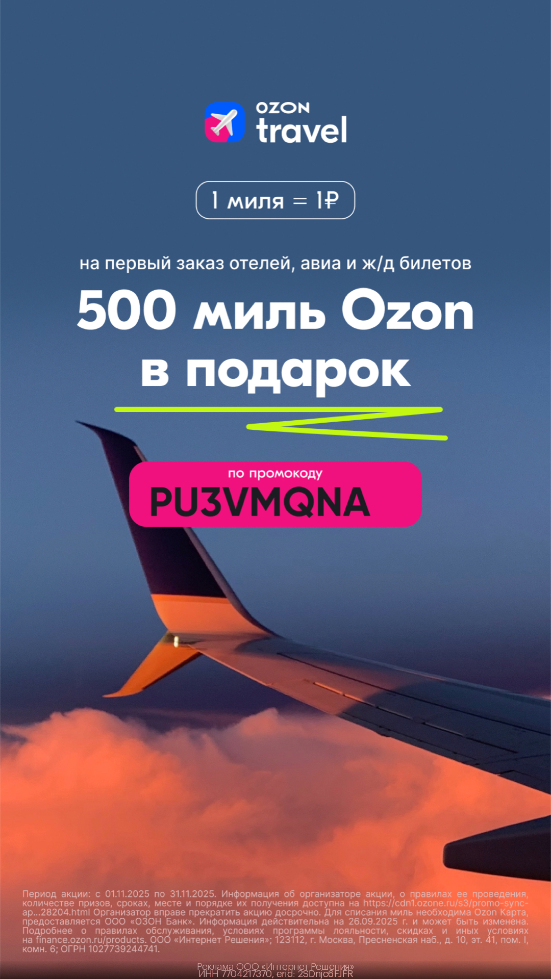 скидка 500 миль Ozon на первый заказ отелей, авиа и ж/д билеты без минимальной суммы бронирования на сайте или в мобильном приложении! +1000 миль всем новым пользователям!